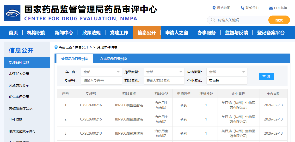 2026-03-252026年3月24日,英百瑞ACC-NK(IBR854)迎来又一里程碑式进展!英百瑞ACC-NK(IBR854)细胞注射液联合多西他赛用于一线标准治疗失败的晚期非小细胞肺癌患者的二线治疗的II期临床试验项目正式获得国家药品监督管理局药品评审中心(CDE)受理(受理号:CXSL2600345、CXSL
